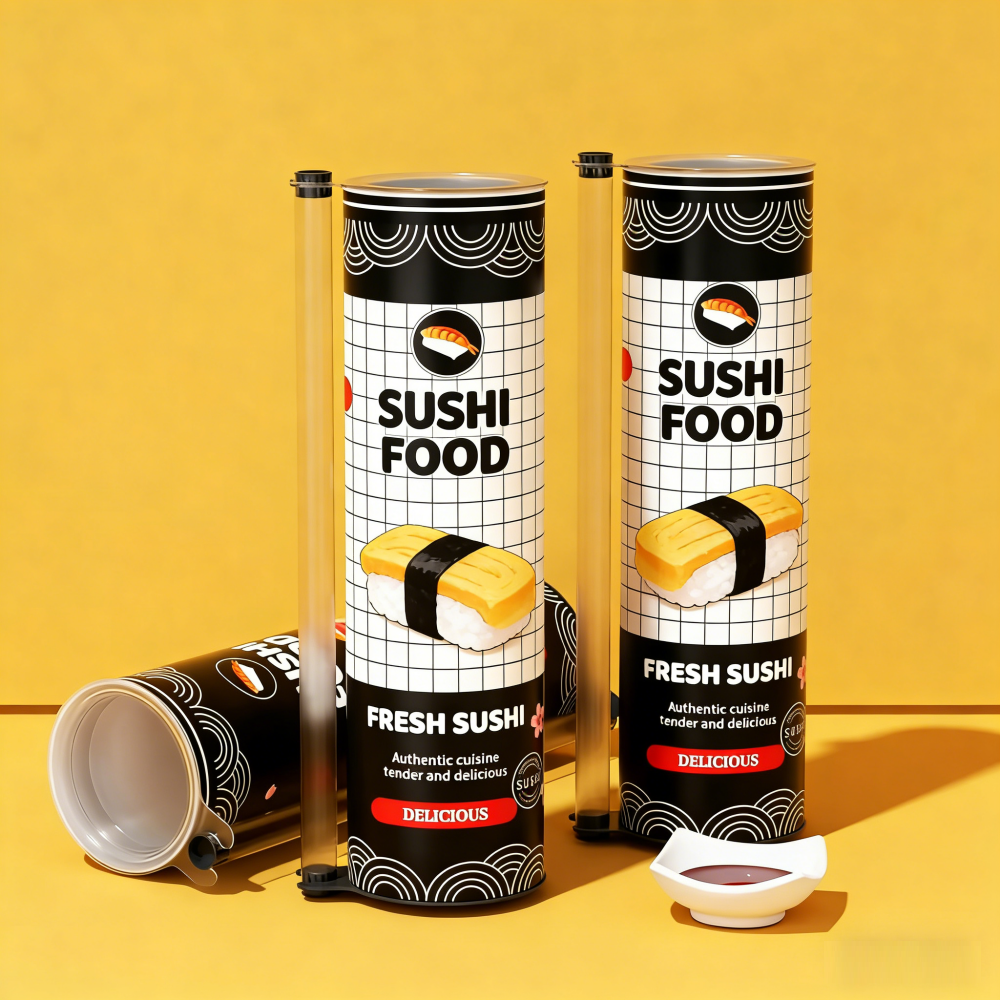 | Name | Umweltfreundliche Push-Pop-Up-Sushi-Papierröhre in Lebensmittelqualität mit Essstäbchen-Papierkanist | Logo-Druck | UV, Heißprägen, Vierfarbendruck |